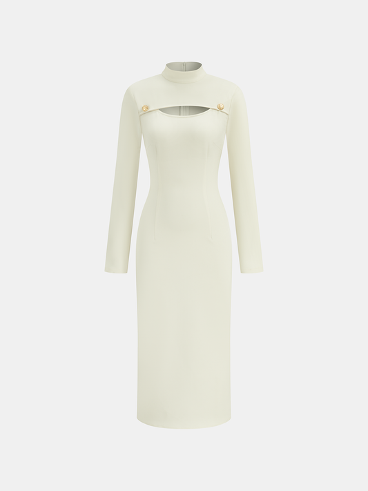 Dik Yakalı Uzun Kollu Dekolteli Vücuda Oturan Elbise